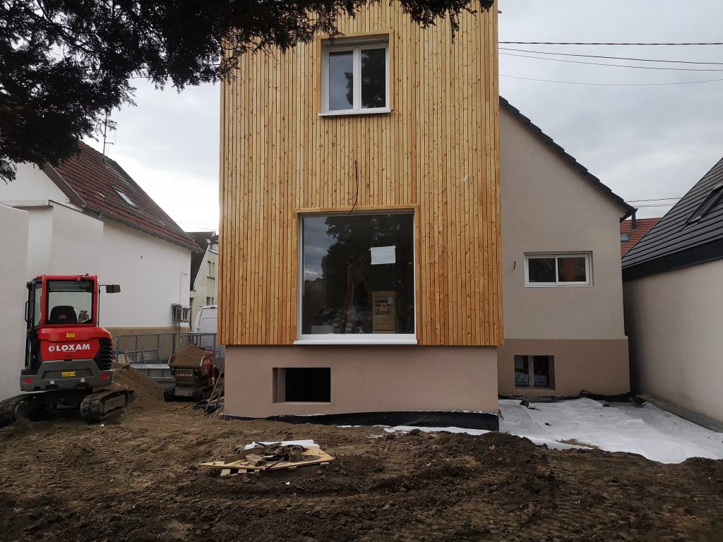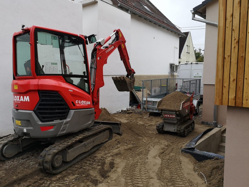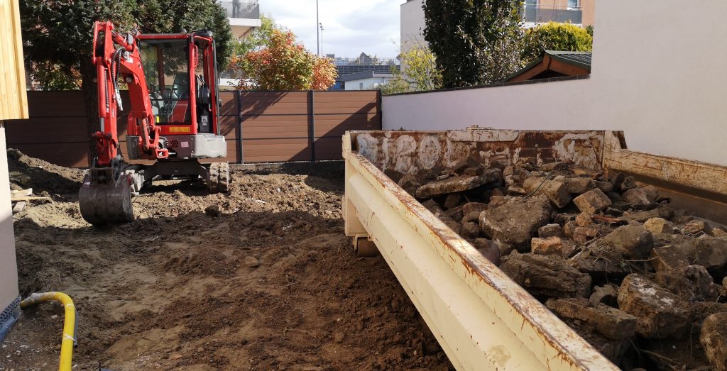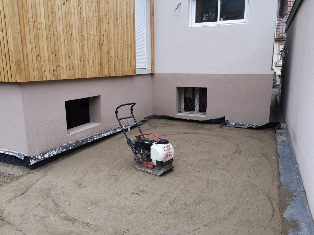 Nivellement des terres, création d’un cheminement et préparation pour une terrasse sur plots.