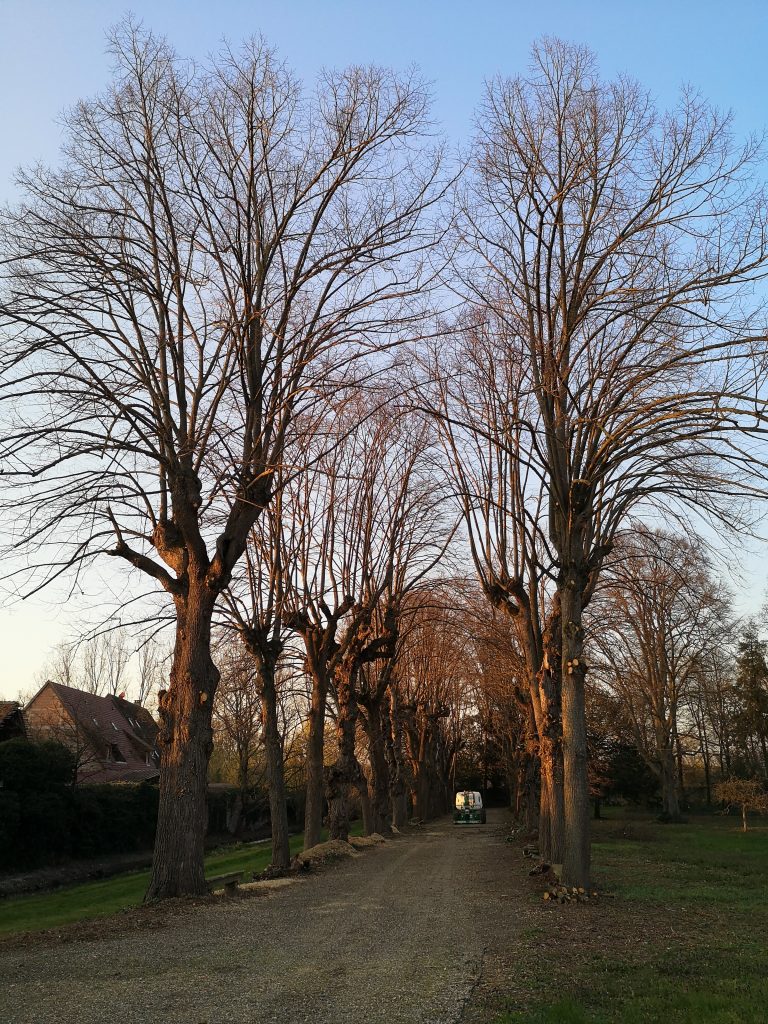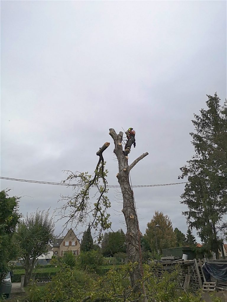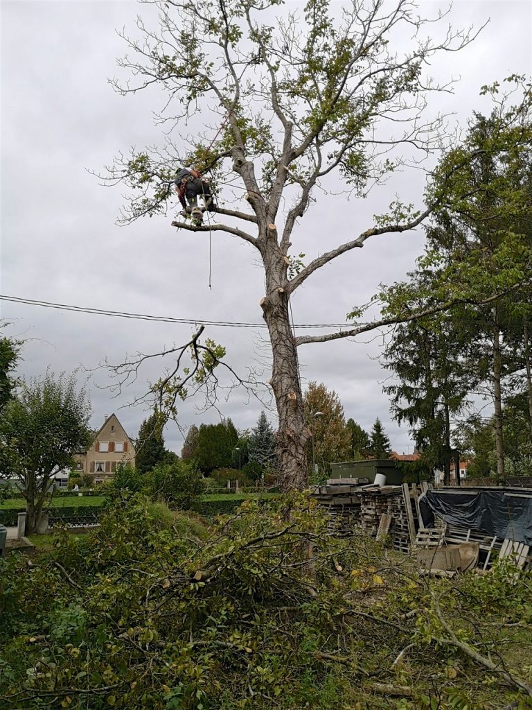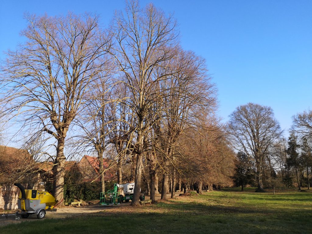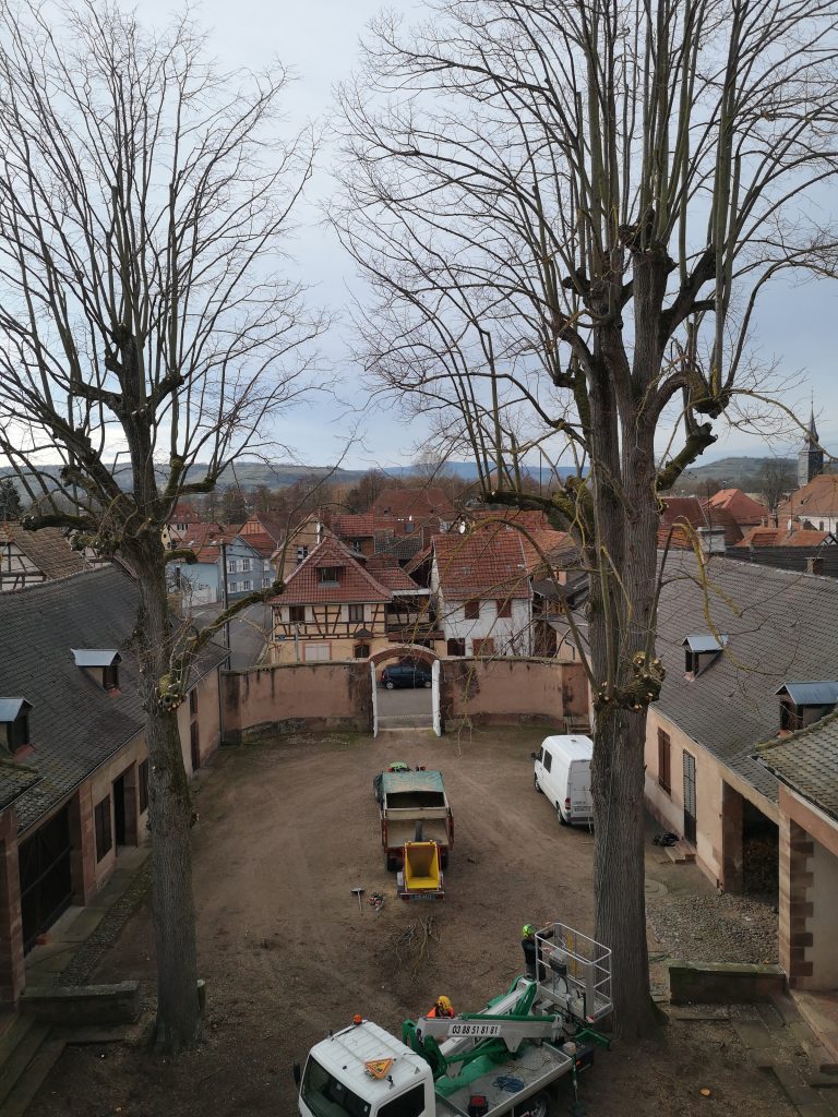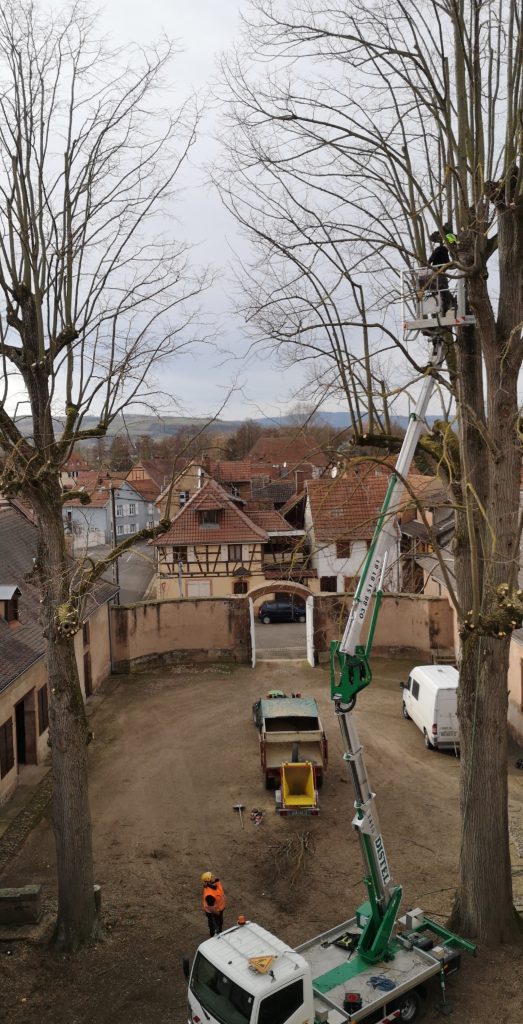 Entretien d’un alignement de tilleuls centenaires. Préservation du patrimoine alsacien et surtout préservation des cavités abritant des chouettes tout en sécurisant l’arbre.